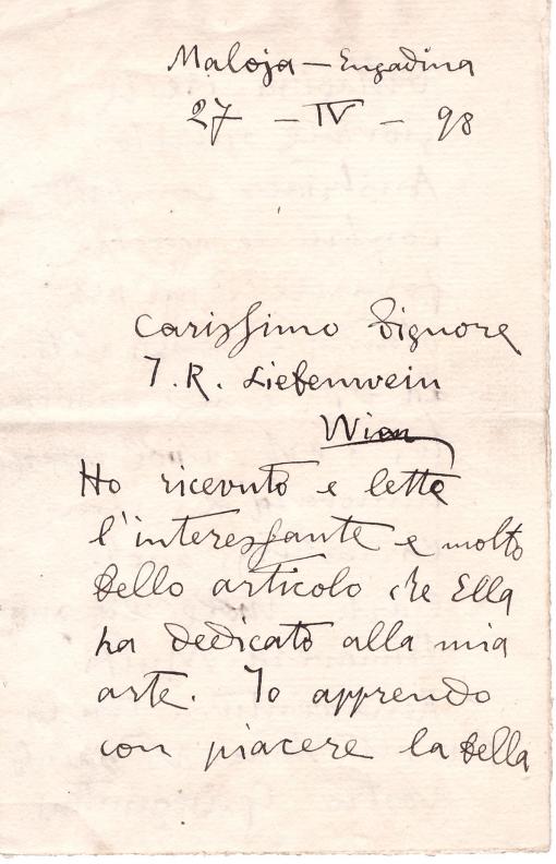 Una lettera inedita scritta da Giovanni Segantini a Richard Liebenwein il 27.4.1898 è stata messa a disposizione dal collezionista Andrì Donatsch di Celerina. Grazie alle ricerche del professor dott. Heinz Adamek di Vienna si è potuto scoprire chi fosse questo Liebenwein. Era uno scrittore viennese che aveva pubblicato un articolo su Segantini nel Wiener Salonblatt del 17 aprile 1898, nel quale sottolineava quanto fosse importante la freschezza dell’arte segantiniana per lo sviluppo dell’arte viennese ancora troppo legata alla tradizione. Ricordiamo che in quell’epoca Segantini era un importante personaggio per i secessionisti viennesi Gustav Klimt, Josef Hoffmann, Koloman Moser e Otto Wagner, con i quali era in contatto.