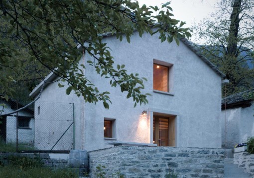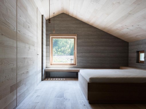 Lo studio cascina è costituito di due ampi spazi. Al pianterreno una sala con angolo cottura, camino e un grande tavolo per lavorare. Al piano superiore, la camera da letto con bagno e cabina armadio. Il Consiglio della Fondazione aveva acquistato, dodici anni or sono, un terreno nei pressi del complesso Garbald, sul quale vi erano due cascine. Delle due, una è recentemente stata scelta per la ristrutturazione: era già stata modificata dal precedente proprietario e aveva dunque perso qualunque valore storico e tradizionale. Il lavoro è stato affidato allo studio di architettura Ruinelli Associati.