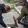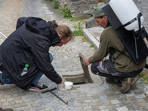 ©grececo GmbH Collaboratori della SUPSI e del Comune di Bregaglia analizzano l'acqua stagnante in un pozzetto stradale alla ricerca di larve di zanzare