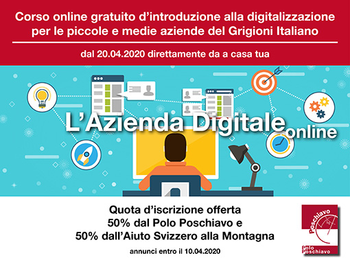 Il Polo Poschiavo, con il patrocinio dell’Associazione Artigiani e Commercianti Valposchiavo, Associazione Artigiani e Commercianti Bregaglia e l’Associazione Moesana Arti e Mestieri, lancia quindi gratuitamente questa proposta formativa che ha l’obiettivo di introdurre le aziende del Grigioni Italiano all’era digitale, mettendo loro a disposizione metodologie di lavoro e strumenti innovativi per far fronte alle sfide di fronte alle quali le pone la crisi attuale.