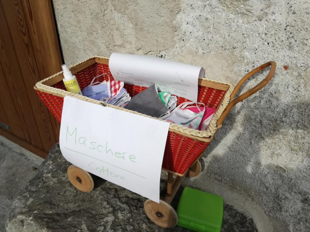 A Castasegna, in zona Boscaia, la signora Laura cuce mascherine di stoffa e le mette a disposizione di tutti. Si può lasciare nella scatoletta un’offerta libera.