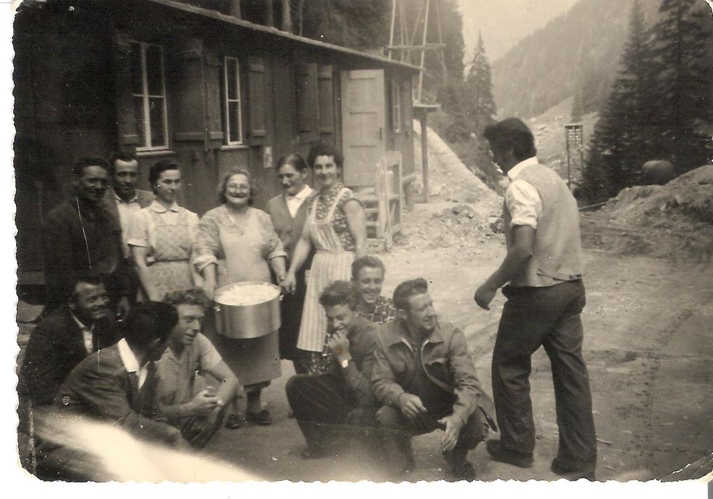 Cesira Gini è la donna più alta del gruppo che con una mano aiuta a tenere il pentolone. Si trova assieme alla responsabile della cucina (una donna di origine bresciana, al centro) e ad altre due donne italiane impiegate nelle mense di cantiere in Svizzera. Posano in compagnia di un gruppo di operai valtellinesi, davanti a una baracca di cantiere nei pressi di Innerferrera, nel 1957. Gli operai si trovavano a Innerferrera per costruire la strada d’accesso alla Valle di Lei, strada che avrebbe permesso di dare avvio alla costruzione dell’omonima diga.