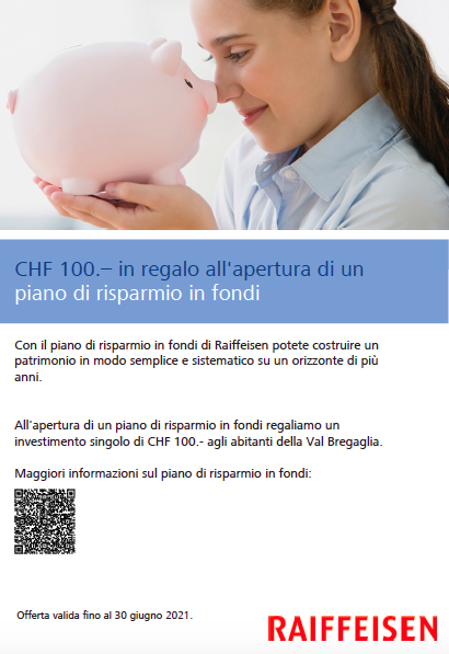 Già a partire da CHF 100.- mensili potete approfittare delle opportunità dei mercati finanziari e realizzare così i vostri sogni personali. La Banca Raiffeisen Engidina Val Müstair ha deciso di regalare questa cifra agli abitanti del Comune di Bregaglia che apriranno un nuovo piano di risparmio in fondi entro la fine di giugno.