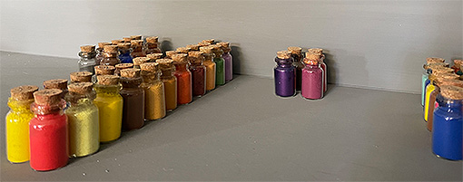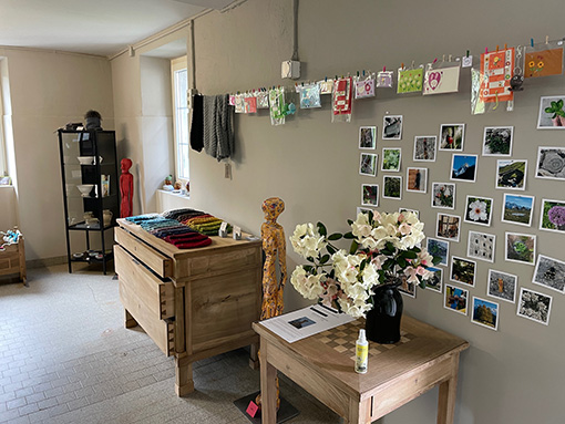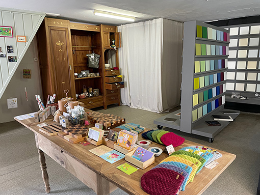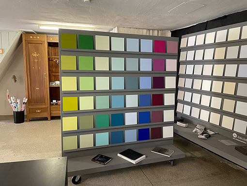 Nello stesso spazio il marito Alberto Giacometti espone un’altra manifattura, quella del colore ed è a disposizione per consulenze, perché ogni colore ha una storia a sé ed è una perla che regala emozioni.