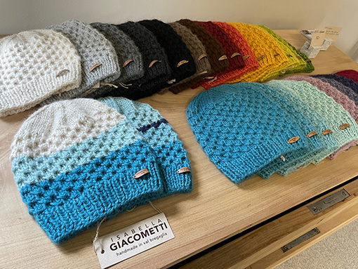 Isabella Giacometti mette in mostra suoi manufatti, in pura alpaca. Nell’ampio locale sono inoltre esposti lavori creati da giovani bregagliotte e bregagliotti.