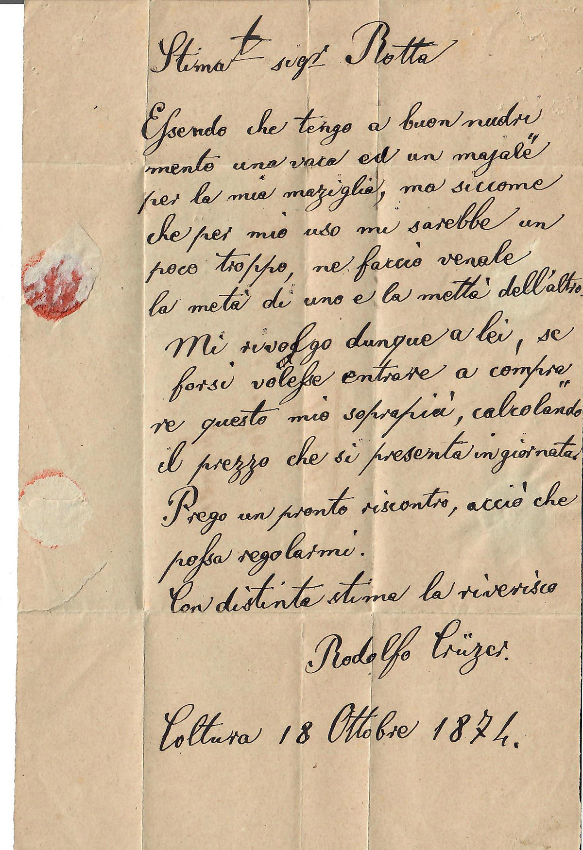 La lettera, meglio la letterina di dimensioni 11×6 cm, è indirizzata al sig. Vincenzo Rotta a Villa da parte di Rodolfo Crüzer il 18 ottobre 1874 da Coltura. Arrivò a destinazione il giorno successivo.