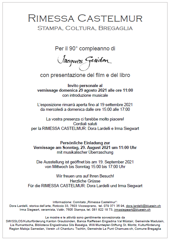 Dora Lardelli e Irma Siegwart, organizzatrici e responsabili della Rimessa Castelmur, invitano tutte le persone interessate all’apertura della nuova esposizione artistica nel locale che si trova accanto al Palazzo Castelmur a Coltura di Stampa, un’esposizione di Jacques Guidon, per festeggiare il suo 90° compleanno.