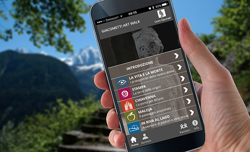 La app “Giacometti Art Walk” è scaricabile gratuitamente. Contiene cinque percorsi da affrontare a piedi e uno da intraprendere in autopostale che coprono il territorio fra Sils, la Val Bregaglia e Chiavenna, alla scoperta degli artisti Alberto, Giovanni e Augusto Giacometti. Funziona grazie alla tecnologia del GPS. Pertanto i testi, le immagini e soprattutto la ventina di mini-film sono fruibili soltanto nei vari luoghi: dove si narra di un aneddoto, dov’è stata dipinta un’opera oppure dov’è avvenuto un fatto importante.