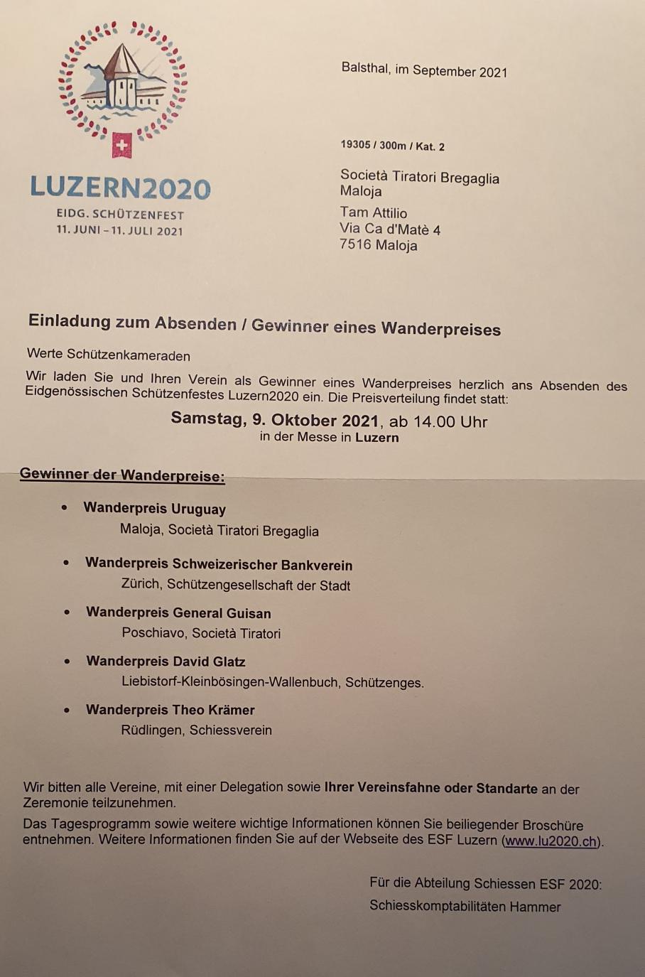 Momento storico per la Società Tiratori Bregaglia. Alla manifestazione di chiusura a Lucerna, sarà premiata col Trofeo Uruguay per la sua grande partecipazione.