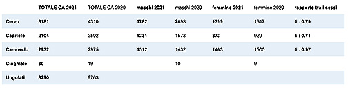 Affinché il mandato di caccia possa essere soddisfatto, durante la caccia di novembre e di dicembre 2021 sarà ancora necessario abbattere 2469 femmine di cervo e i loro vitelli. Un’ulteriore regolazione è necessaria anche per gli effettivi di capriolo. Perciò in diverse regioni si dovranno ancora abbattere 282 femmine di capriolo e i loro piccoli nati quest’anno. Poiché l’andamento della caccia in novembre e dicembre dipende in misura molto importante anche dalla presenza di cervi e caprioli nonché dalle condizioni climatiche, il completamento dei piani di abbattimento di quest’anno sarà un compito impegnativo.