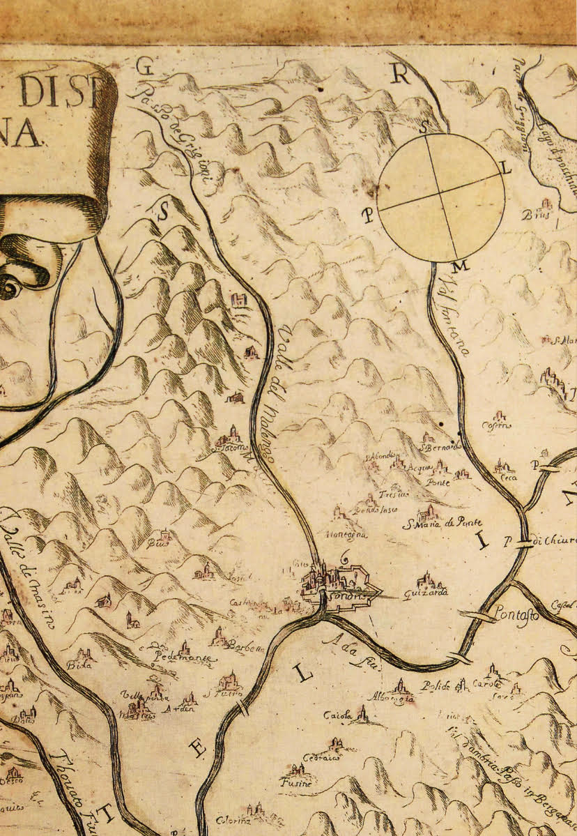 Da questa cartina del primo ’600 di Sondrio e dintorni si può ben cogliere che affronteremo il filone storico. In realtà, si intende illuminare il valore del laicato nel processo di Riforma in Valtellina nella prima metà del XVI secolo, ma l’immagine per i rilievi orografici e le valli ben si collega al nostro tema in cui la conoscenza del territorio (di passi, anfratti e orridi) significò per alcuni vita.