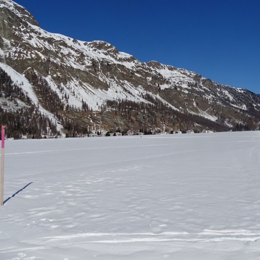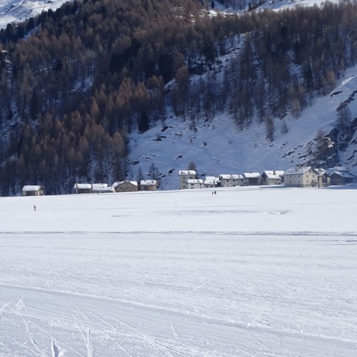 Partiti alle 10.30 dal Maloja a 1815 m s.l.m. ci siamo incamminati vicino alla pista di sci su quella pedonale lungo il lago che quest’anno è poco ghiacciato ma ci sostiene comunque…