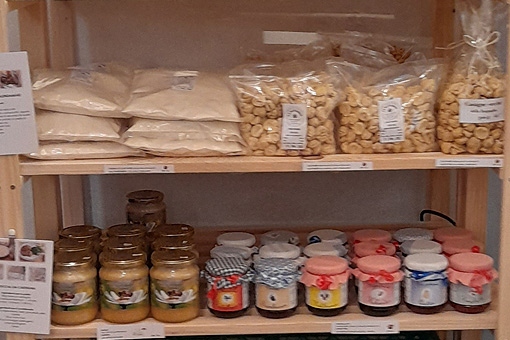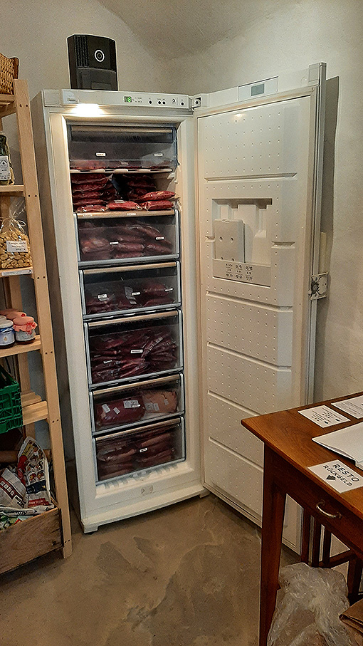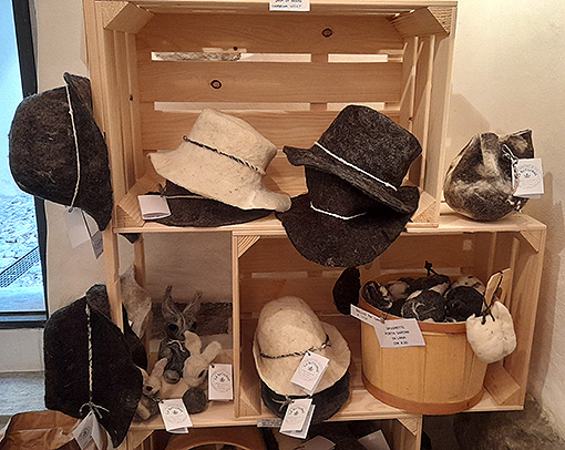 Abbiamo preso delle pecore la scorsa primavera e per non buttare via la lana ho iniziato a lavorarla, creando manufatti da vendere. Vendiamo anche la carne che Nicola, il mio compagno, ed io alleviamo. Abbiamo carne dei nostri vitelloni, impacchettata e congelata, divisa per tipo. All’interno del negozietto c’è un congelatore bianco pieno della nostra carne. Poi c’è un frigo con salametti e carne secca di pecora: möckli. Qui è facile allevare bio, perché le bestie hanno i prati e l’alpe vicine.