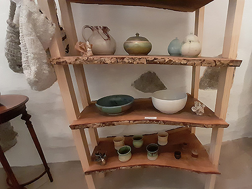 Ci sono anche altri prodotti della valle: miele, castagne secche non affumicate, farina di castagne e conserve e le ceramiche di Pascale Giovanoli. Lei le fa nel suo laboratorio a Stampa, mentre la cottura la facciamo qui a Bondo. Alle ceramiche viene fatta la glasatura, cioè durante la cottura la ceramica viene lucidata. I colori sono tutti naturali.