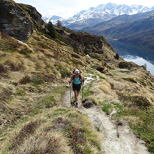 Il primo pezzo salendo dal Maloja è verso il Lunghin. Non ho trovato la solita vipera dato che eravamo ancora in maggio. Probabilmente dormiva ancora. Poco male e poi siamo svoltati a destra salendo verso Blaunca.