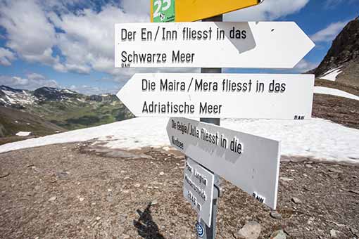 Prima di mettersi in sella per partire lungo i tre diversi itinerari, sabato 23 luglio i partecipanti saliranno a piedi da Maloja fino al triplice spartiacque del Passo del Lunghin, a quota 2644 metri. Da questa montagna, infatti, le acque possono raggiungere il Mare Adriatico, il Mar Nero oppure il Mare del Nord.