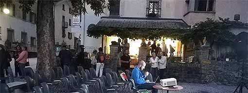 Al racconto dei passi che l’associazione “Progetti d’arte in val Bregaglia” ha compiuto prima e dopo il 2018 è seguita la visione all’aperto, accompagnata da una colonna sonora di tutto rispetto: Bob Dylan, una sonata di pianoforte e Fabrizio de André. L’arte vista attraverso gli occhi di Ursula, che poi propone un filmato del padre: in 18 minuti si rivedono personaggi di un tempo che fu, Castasegna 2022 rivede i giochi, gli abiti, le insegne perdute di cinquanta anni prima e anche qui la musica accompagna, sdrammatizza e, proprio per questo, commuove.