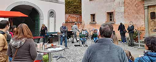 Eli Müller, direttrice del BET – Bregaglia Engadin Turismo, ha dato il benvenuto alle persone presenti sia in italiano che in tedesco e subito ha passato la parola al Sindaco Fernando Giovanoli. Il sindaco nel suo discorso ha fatto riferimento al cambiamento climatico collegandosi con il discorso che magari i prossimi anni le castagne saranno disponibili anche a Sopraporta. Nel suo discorso dai toni piuttosto seriosi e attenti all’attualità ha avuto anche modo di fare una battuta circa la maggiore età raggiunta dal festival. Non ha mancato di ricordare che i castanicoltori vivono del loro raccolto, per cui ha invitato chi volesse raccogliere le castagne bregagliotte a limitarsi alle due aree di libera raccolta messe a disposizione del pubblico e di fare attenzione ai luoghi privati. Non ci sono recinti che chiudono i castagneti per cui sta proprio alla responsabilità di ognuno di rispettare gli spazi privati.