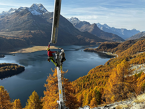 A fine ottobre 2022, sotto la direzione dell’Ufficio foreste e pericoli naturali sono state installate le ultime antenne. Per via delle condizioni topografiche, il cantiere situato in alto sopra la strada del Maloja ha rappresentato una sfida particolare. Grazie alla buona collaborazione tra tutti gli attori coinvolti è stato possibile porre in esercizio le antenne in tempo per la stagione invernale.