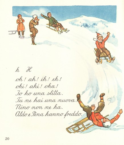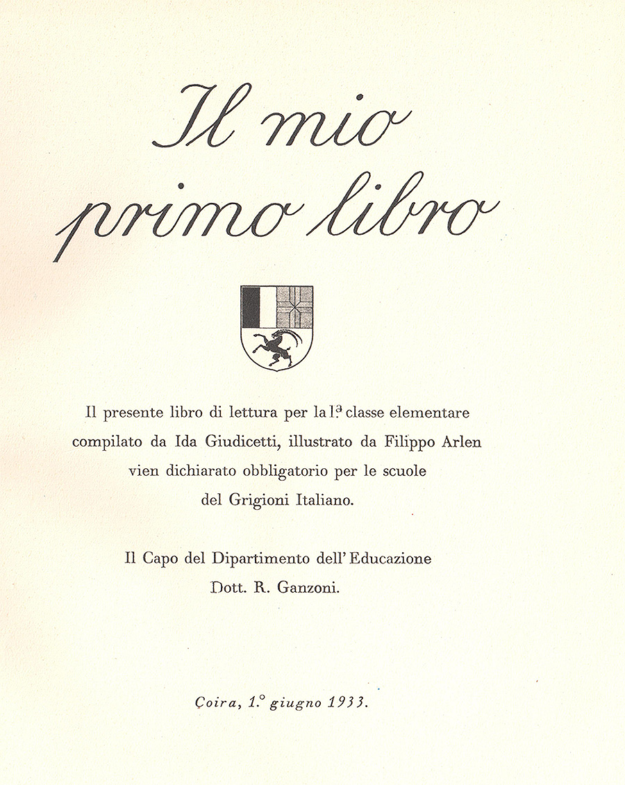 Descrizione: il testo è stato realizzato per gli allievi della scuola primaria e si legge al suo interno: per la prima classe elementare vien dichiarato obbligatorio per le scuole Grigioni Italiano. Da qui il legame con la Bregaglia.