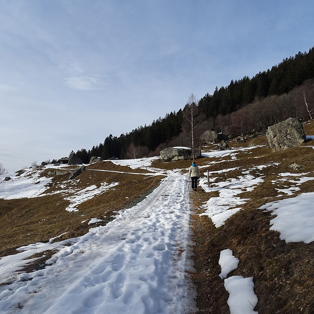 Siamo saliti lentamente prima a Brügnett (1’350 metri s.l.m.) per vedere il Badile ed infine arrivare a Durbegia a 1’410 metri s.l.m. Qui alle 13.20 ci siamo fermati, con un pallido sole che non ci scaldava. Per fortuna il tè è veramente servito. Dopo di che siamo ridiscesi arrivando alle 15 a Vicosoprano dove abbiamo ripreso l’auto per tornare a casa, a Prosto.