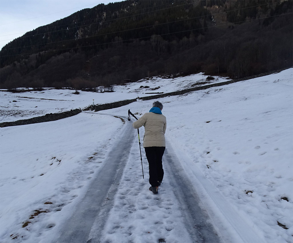 Partiti alle 12 da Vicosoprano a 1’057 metri s.l.m, siamo risaliti lentamente trovando subito neve sulla strada e molto ghiaccio. Io ero con le scarpe da corsa, ed ho sbagliato, era meglio mettere gli scarponi, lo so per la prossima volta.