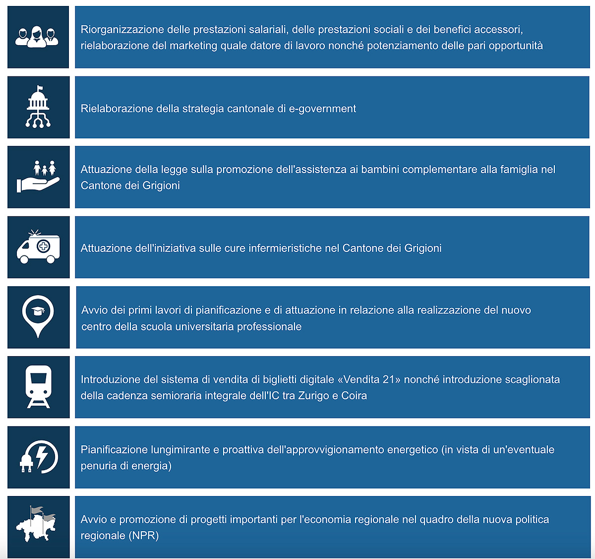 Conformemente alla Costituzione cantonale, il programma di Governo e il piano finanziario sono gli strumenti centrali della gestione strategica e politica del Cantone dei Grigioni. Insieme costituiscono gli strumenti per la pianificazione a medio termine dei punti centrali del lavoro del Governo. Il programma di Governo 2021–2024 si concentra sui punti principali «Digitalizzazione e innovazione», «Green Deal» nonché «Cantone di montagna dalle molteplici sfaccettature». I punti centrali di sviluppo in esso contenuti vengono concretizzati nei programmi annuali e successivamente attuati. Il programma annuale 2023 che è stato presentato prevede complessivamente 94 obiettivi annuali ed è stato discusso nel quadro del messaggio sul preventivo in occasione della sessione di dicembre del Gran Consiglio. I punti centrali più importanti della pianificazione annuale 2023 sono: