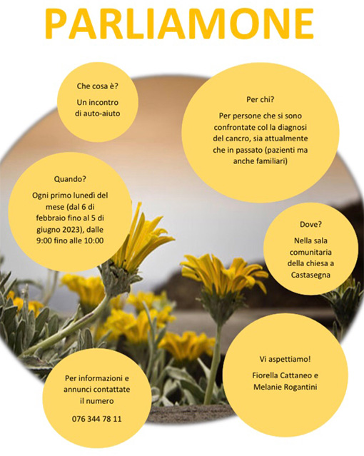 Parliamone è un’iniziativa volta al confronto sul cancro, dedicata a chi lo vive in prima persona e a chi è vicino ad un proprio caro. Dal 6 febbraio 2023, ogni primo lunedì del mese, dalle 9 alle 10 appuntamento a Castasegna.