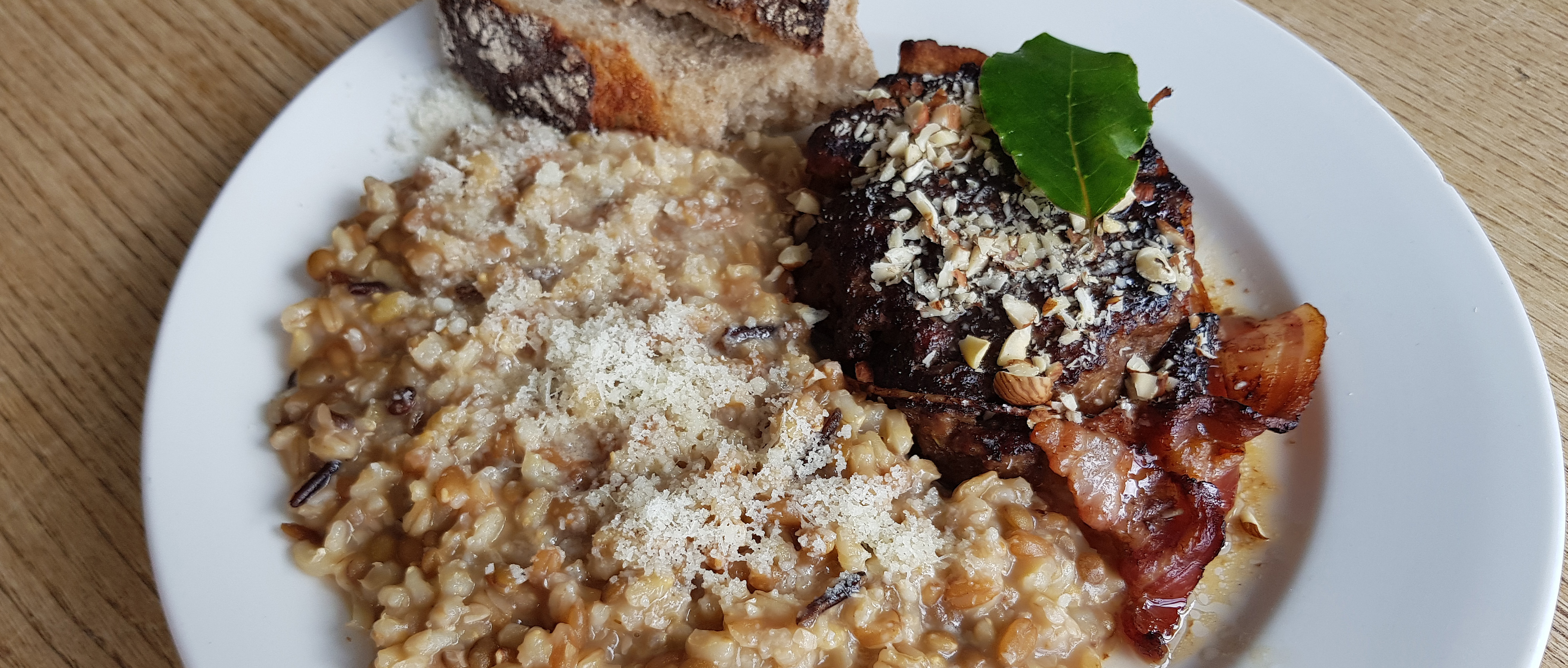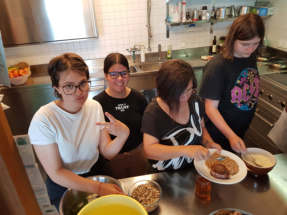 Giovedì, a pranzo, abbiamo assaggiato un menù romano preparato da alcune scolare, dalla maestra e dal cuoco della scuola. Abbiamo preparato carne con della pancetta legata attorno, con miele e nocciole e una foglia di alloro come decorazione e del risotto biologico con chicchi di avena, orzo pelato, spelta, riso integrale, lenticchie, grano saraceno, segale e riso selvatico.