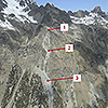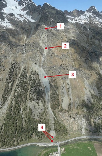 Zona di distacco sulla parete rocciosa Blais Parè (1), canaloni (2), pietraia (3), ubicazione vallo di protezione e palizzate (4).