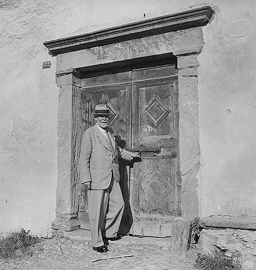 Augusto Giacometti davanti alla sua casa nativa a Stampa.