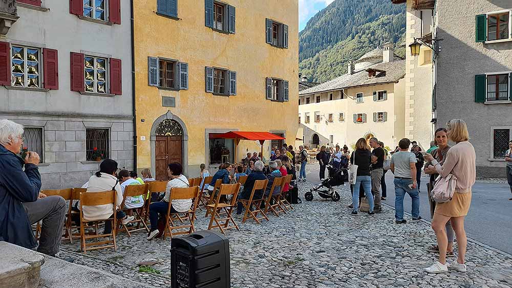 A dare il via al Festival è Fernando Giovanoli, sindaco del Comune di Bregaglia, che mette subito l’accento sugli aspetti positivi e al contempo negativi del cambiamento climatico. Siamo alla fine di settembre e le giornate sono ancora calde e le castagne pronte per essere raccolte. Facendo una battuta, Fernando, dice che, se il clima continua di questo passo si potranno piantare dei castagni anche sul suolo del territorio del villaggio di Casaccia che è a circa 1200 mslm.