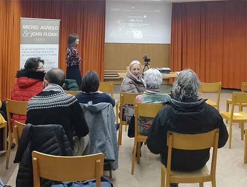 Il 4 ottobre Marianna Iannacone, impegnata in un dottorato dove si approccerà anche a Michelagnolo e John Florio, presso l’Università degli Studi dell’Insubria, ha intrattenuto il pubblico nella sala comunitaria di Castasegna. Il secondo, questo, di quattro appuntamenti di “Florio Vive 2023″.