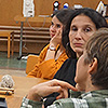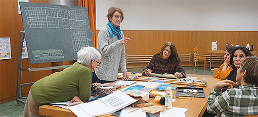 Ho avuto l’occasione di assistere a un momento della lezione dell’insegnante Jutta Meier sabato mattina scorso; ad accogliermi è stata Anni Giovannini. In quel momento la signora Jutta Meier stava chiarendo gli ultimi dubbi che le dieci partecipanti avevano maturato in merito al lavoro svolto nella settimana di lavoro al telaio che si apprestavano a concludere. Anni Giovannini mi ha concesso del tempo per rispondere ad alcune mie domande