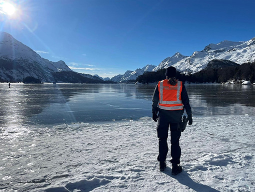 La Polizia cantonale dei Grigioni invita le persone a non avventurarsi sul ghiaccio, che dovrebbe essere sicuro. Entrare nel ghiaccio dei laghi dell’Alta Engadina è a proprio rischio e pericolo.