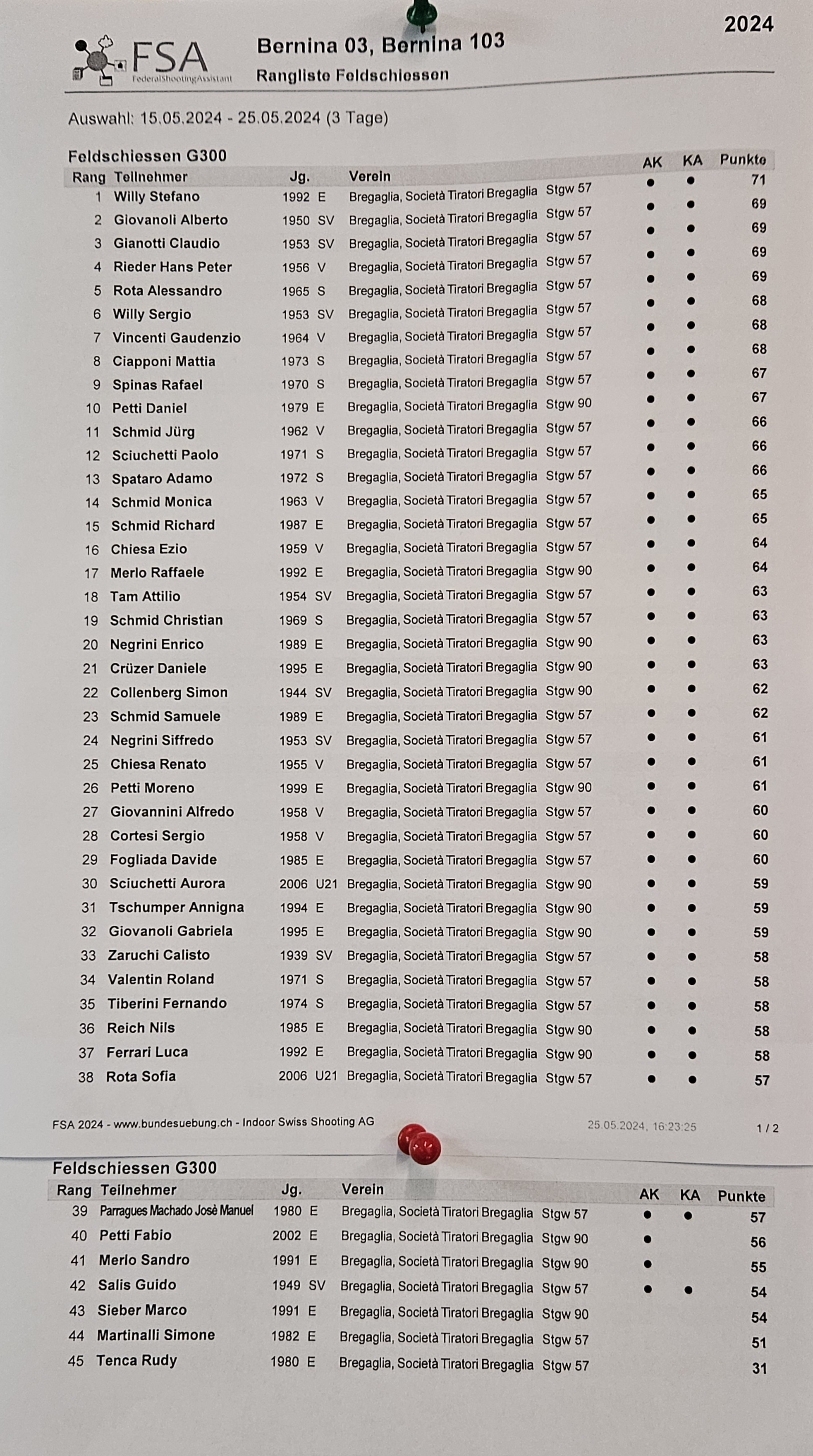 In cima alla classifica del Tiro federale in campagna, con 71 punti si trova Stefano Willy, che ha sparato il tiro anticipato. Bravo Dudo. Ottimo risultato. Auguroni! Con lo stesso punteggio (tutti 69 punti) seguono i due doppi veterani Alberto Giovanoli (annata 1950) e Claudio Gianotti (annata 1953), il veterano Hampi Rieder e Alessandro Rota. Complimenti anche a loro!