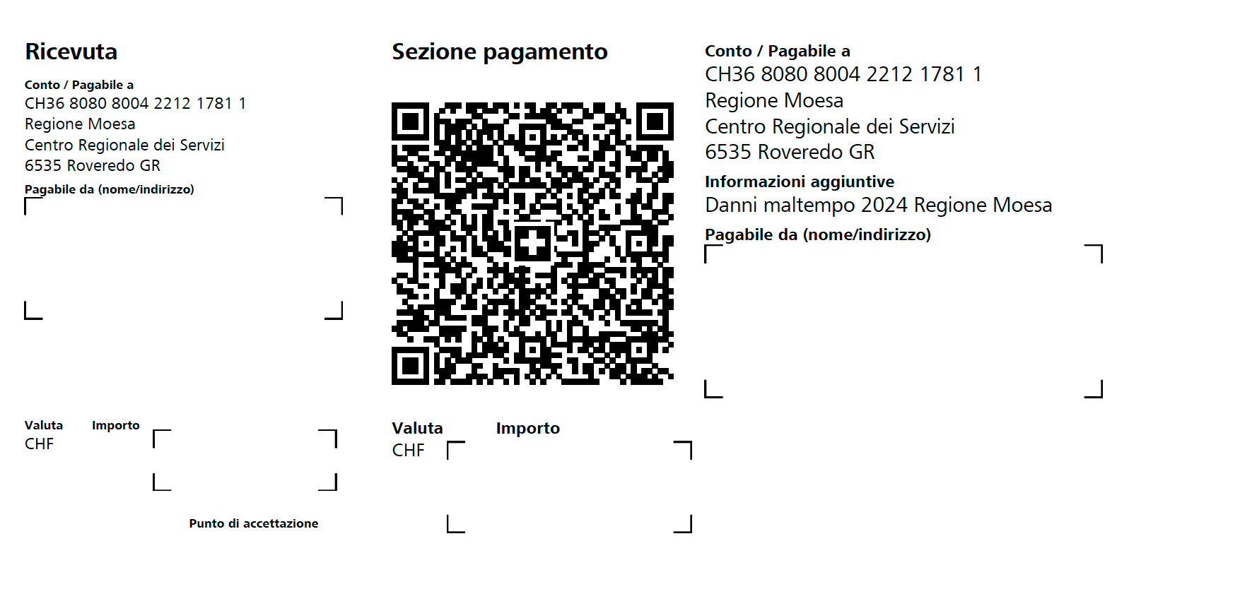 Chi volesse fare una donazione può farlo tramite il conto CH36 8080 8004 2212 1781 1 intestato a Regione Moesa con causale: “Danni maltempo 2024″.