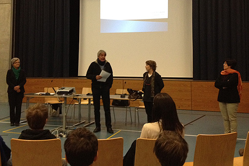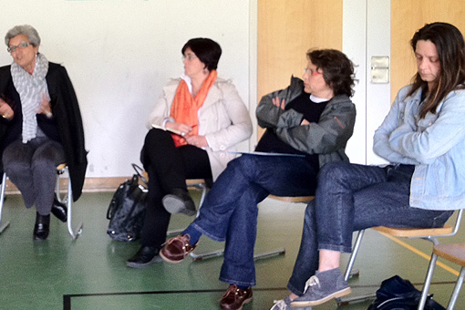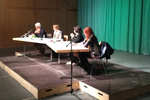 Da sinistra: Valentina Firenzuoli, Antonio Walther, Nicoletta Maraschio, Valeria Saura. Lunedì, 21 maggio. Tavola rotonda a Bondo, “Le competenze linguistiche dei giovani”.
