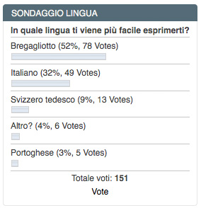 Hanno risposto 151 lettori. Non sappiamo da dove. Possiamo ipotizzare che molti abitino in Bregaglia, altri avranno risposto da fuori. I siti web sono per definizione aperti a tutto il mondo. La maggioranza ha scelto il bregagliotto quale lingua preferita. Sono state 78 persone, pari al 52 % dei partecipanti. Al secondo posto si è classificata la lingua italiana, con 49 voti (il 32%). Di questi è possibile che alcuni provengano dai nostri vicini italiani, interessati a vedere cosa succede al di là del loro confine.