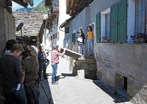 La troupe a Soglio si prepara a girare una scena in cui il postino consegna una raccomandata