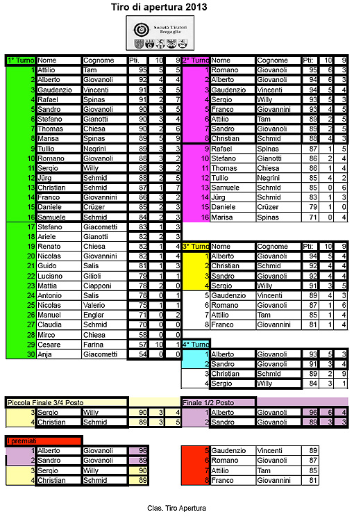 Società tiratori Bregaglia. La classifica del tiro di apertura.Clicca sulla classifica per scaricarla in .pdf. Accedi al programma 2013, della Società tiratori Bregaglia.