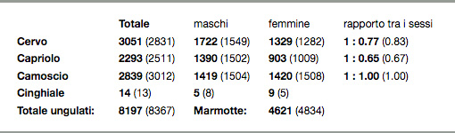 Con 1722 maschi e 1329 femmine abbattuti, la ripartizione dei sessi non è equilibrata. La grandezza degli effettivi di cervo viene tuttavia regolata in primo luogo attraverso l’abbattimento delle femmine. Con la caccia autunnale si dovrà procedere principalmente agli interventi sulla popolazione di capi femmina, a seconda delle esigenze regionali.