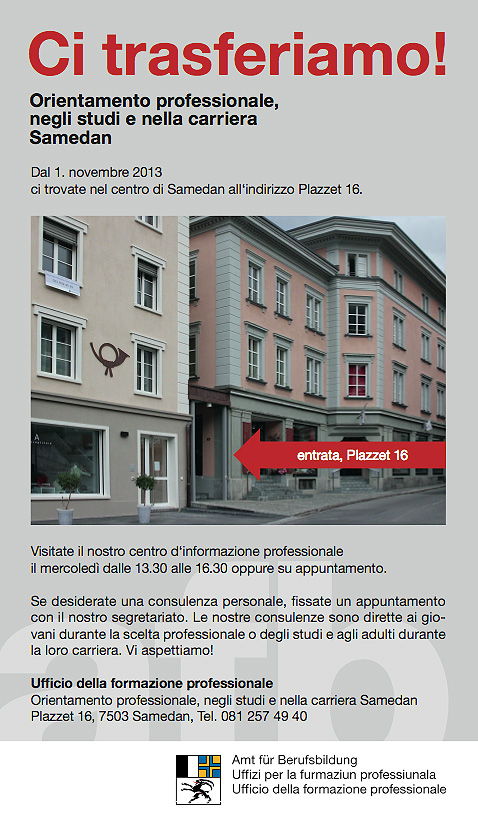 //inserzione a pagamento\\Nuova sede a Samedan. Visitate il nostro centro d‘informazione professionale il mercoledì dalle 13.30 alle 16.30 oppure su appuntamento.