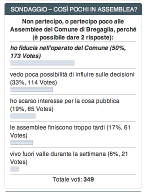 Il risultato finale sembrerebbe essere di segno positivo per l’amministrazione comunale visto che la maggioranza (173 voti) di coloro che dichiarano di non partecipare o partecipare poco alle assemblee comunali afferma di non farlo perché si fida dell’operato del Comune.