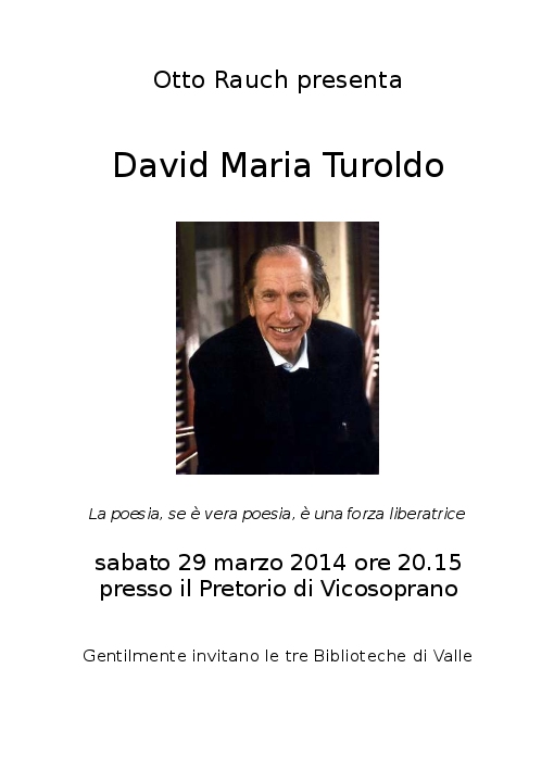 Terzo appuntamento organizzato dalle biblioteche di valle: dopo Pier Paolo Pasolini e Giuseppe Ungaretti, sabato verrà presentato David Maria Turoldo. Del frate dell’Ordine dei Servi di Maria parlerà il pastore Otto Rauch, che lo ha anche conosciuto personalmente.