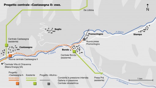 “Bondea” diventa “Castasegna II”. Il ridimensionamento del progetto ewz Bondea permetterà alla ditta Scartazzini di ripresentare il suo progetto originale per la costruzione di una centrale idroelettrica presso il mulino di Promontogno.