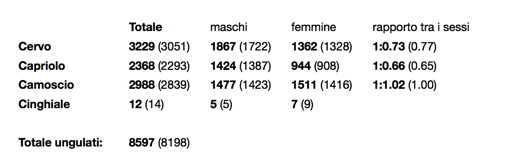 Con 1867 maschi e 1362 femmine abbattuti, la ripartizione dei sessi non è equilibrata. La grandezza degli effettivi di cervo viene tuttavia regolata in primo luogo attraverso l’abbattimento delle femmine. Con la caccia autunnale si dovrà procedere principalmente agli interventi sulla popolazione di capi femmina, a seconda delle esigenze regionali.
