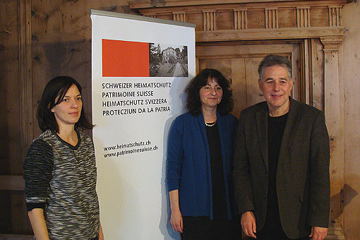 Nella foto da sinistra a destra: Sabrina Németh (responsabile di progetto Premio Wakker Heimatschutz Svizzera), Anna Giacometti (sindaco del Comune di Bregaglia), Adrian Schmid (direttore Heimatschutz Svizzera)