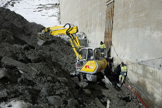 «Certo, svuotando l’invaso – racconta Andres Fasciati, direttore dell’ewz Bregaglia – ci siamo trovati davanti a un bel mucchio di fango. L’abbiamo dovuto spostare, per consentire a tutta l’acqua di defluire verso il tubo di scarico». Una volta eliminata l’acqua, ha cominciato a costruire le impalcature la ditta Luzi di Cazis. Nel frattempo, essendo emersa anche la camera di presa dell’acqua, si è potuto procedere ai controlli previsti. Anche in quella zona si è scavato nella sabbia, per migliorare il futuro ingresso dell’acqua. Subito dopo la camera di raccolta ci sono due valvole a farfalla, che sono state rimosse e trasportate all’officina specializzata Nugo Romano a Piedimulera (nella provincia piemontese di Verbano Cusio Ossola).