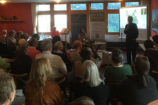 In conclusione di serata, Patrik Giovanoli ha dato la parola a Corrado Sergio Panzieri, lo studioso che per primo – alcuni anni or sono – aveva eseguito delle ricerche in Bregaglia sulle tracce di Michel Agnolo e John Florio.
